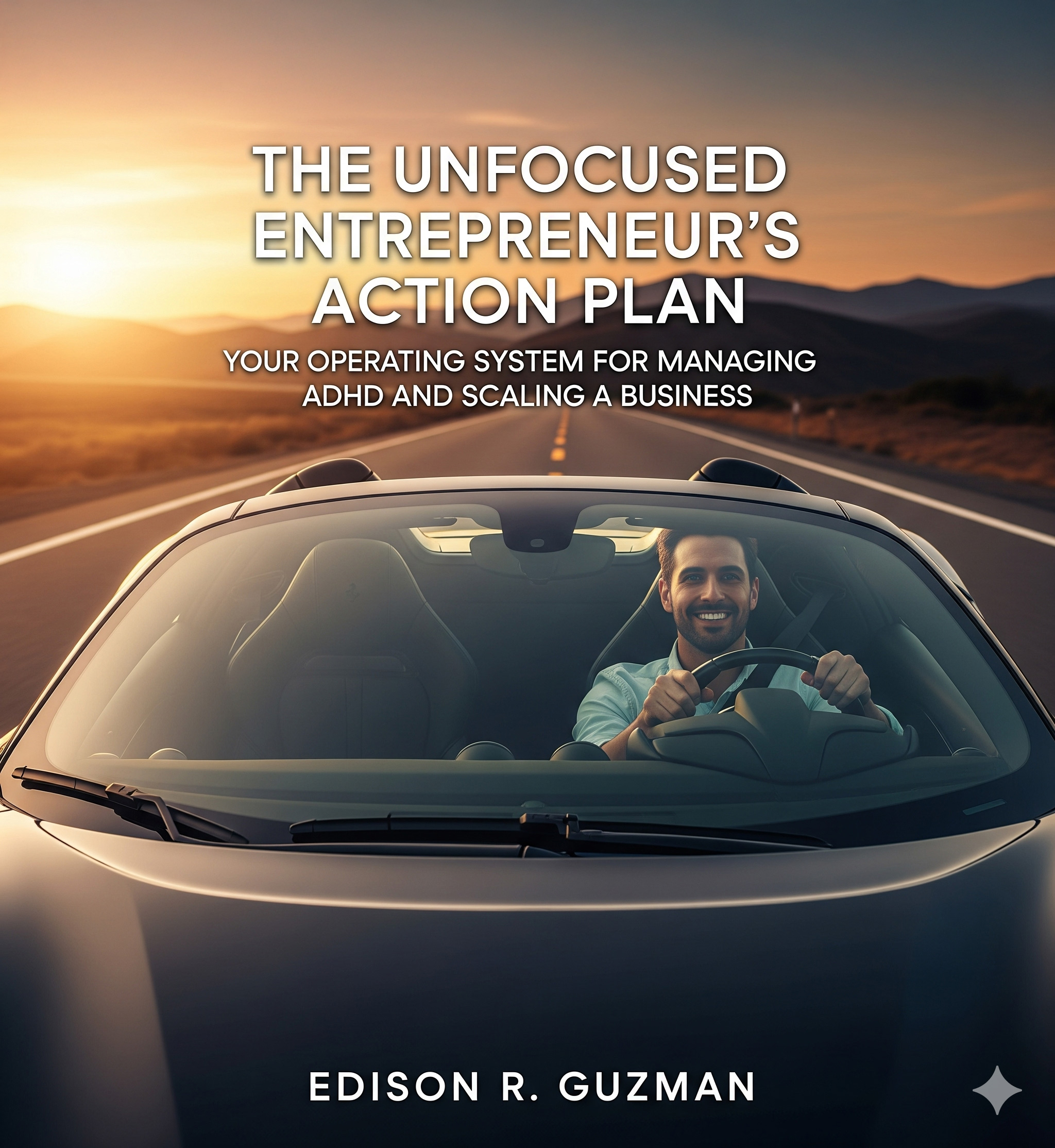 The Unfocused Entrepreneur’s Action Plan is the key you’ve been searching for. Written by Edison Guzman, who has spent 25+ years running a successful ad agency with a classic ADHD brain, this isn’t another dry “productivity” book. It’s a funny, practical, and brutally honest guide to stop fighting your brain and start working with it.